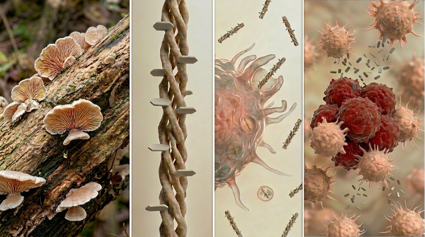 My se to rozhodli změnit. V rámci našeho projektu vyvíjíme terapii, která nejen zlepšuje cílení chemoterapie, ale současně reaktivuje tělu vlastní imunitu, bez závislosti na mutacích rakovinných buněk. Vyrobili jsme proto unikátní biologicky aktivní transportní systémy na bázi betaglukanů z vybraných hub. Tyto systémy si lze představit jako šroubovice o průměru jednotek nanometrů, které na svém povrchu nesou protinádorové „střely“ v podobě chemoterapeutika. Nosiče ale neslouží jen jako obyčejné „držáky“ na léčivo. Jsou navrženy tak, aby se mohly cíleně přichytit na makrofágy, buňky našeho imunitního systému, a ty následně „probudit“ – aktivovat. K tomu využíváme biologické procesy staré miliony let a vlastní všem lidem, bez rozdílu věku, rasy či pohlaví. Aktivované makrofágy potom nanošroubovice i s nákladem samy transportují tam, kde je nejvíce potřeba – přímo k nádoru nebo do lymfatických uzlin, kde nejčastěji vznikají metastáze. V cílové destinaci pak uvolní léčivo, které přímo ničí rakovinné buňky, a zároveň zburcují k útoku i další buňky imunitního systému. Díky využití vlastních buněk pacienta a přírodních látek se nemusíme spoléhat na specifické mutace vyžadované v konvenční imunoterapii, a přitom minimalizovat vedlejší účinky chemoterapie.